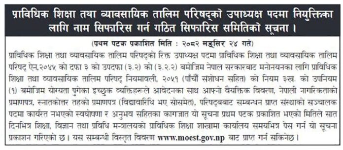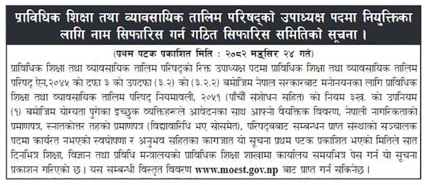 २४ मंसिर,काठमाडौँ । प्राविधिक शिक्षा तथा व्यावसायिक तालिम परिषद् सीटीईभीटीको उपाध्यक्ष पदका लागि दरखास्त आह्वान गरिएको छ। नाम छनोट तथा सिफारिस समितिले आज सार्वजनिक सूचना जारी गर्दै आवश्यक योग्यता पुगेका इच्छुक उम्मेदवारहरूलाई सात दिनभित्र आवेदन दिन आग्रह गरेको हो।