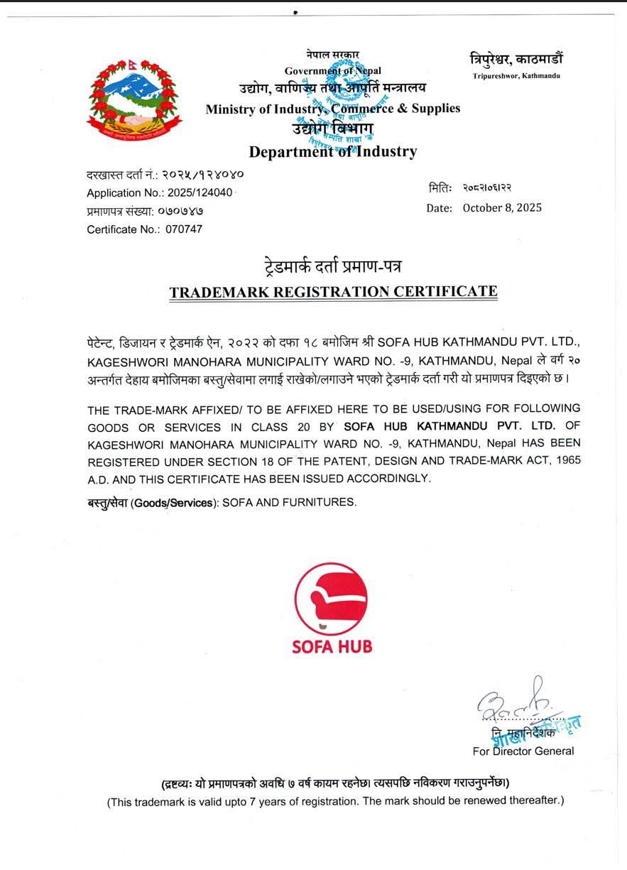 यसअघि पटक–पटक “Sofa Hub” नाम प्रयोग नगर्न अनुरोध गरिए पनि केही व्यक्तिहरूले बेवास्ता गरेपछि दशैं अगावै ‘Sofa Hub’ नाम र लोगोको आधिकारिक ट्रेडमार्क दर्ता गरिसकिएको पनि विज्ञप्तिमा उल्लेख छ। दशैंको समयमा कसैको व्यवसायमा प्रत्यक्ष असर नपरोस् भन्ने उद्देश्यले सो अवधिमा सामाजिक सञ्जालमा सञ्चालन भइरहेका पेजहरूमा कुनै पनि कपीराइट स्ट्राइक जारी नगरिएको जानकारी दिइएको छ।