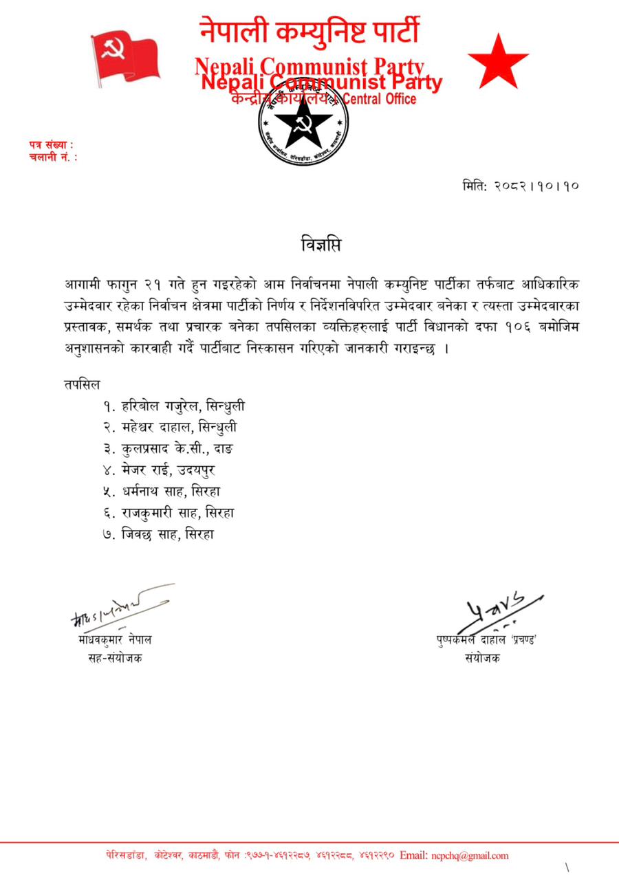 विज्ञप्तिमा पार्टी विधानको दफा १०६ बमोजिम अनुशासनात्मक कारबाही स्वरूप सम्बन्धित व्यक्तिहरूलाई पार्टी सदस्यताबाट निष्कासन गरिएको जनाइएको छ।